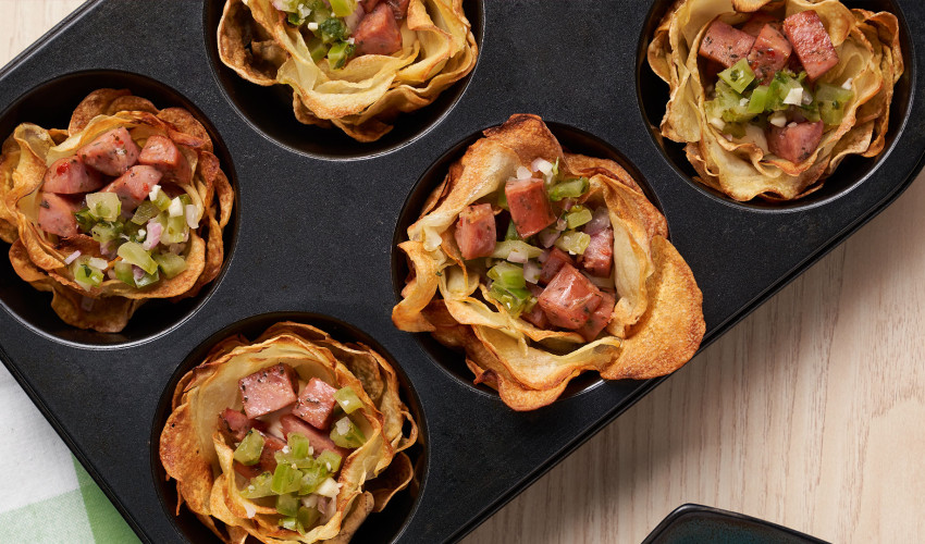 Canastas crocantes de papa rellenas de pico de gallo verde y salchichas Frank´s