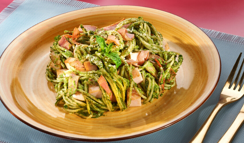 Pasta al pesto de espinaca con Jamón de Pechuga de Pavo Caserío
